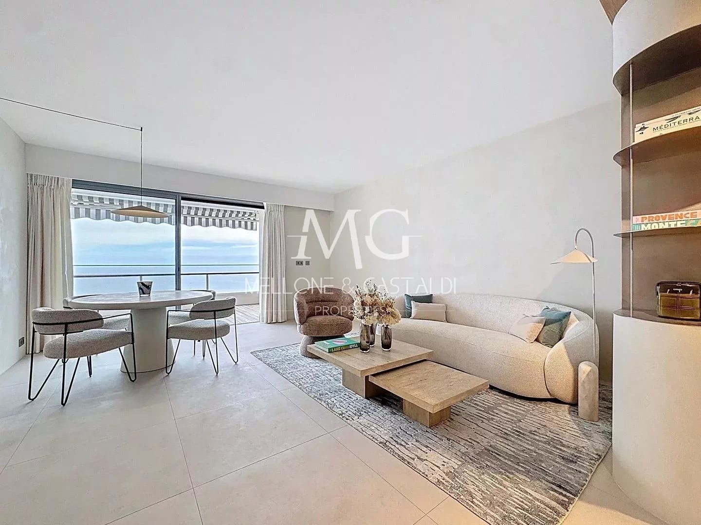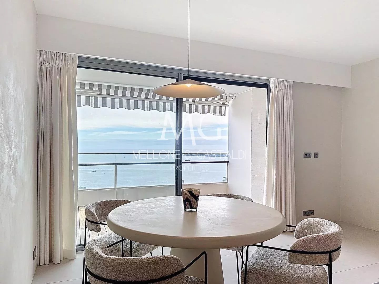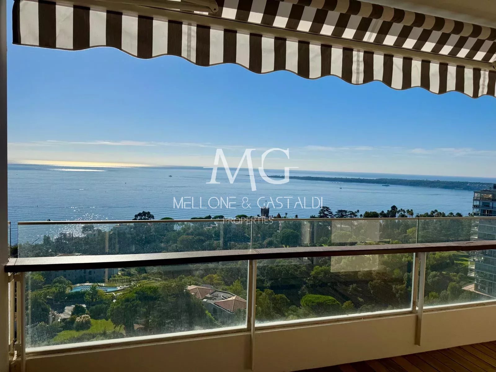 Located on a high floor, the apartment enjoys abundant natural light and offers a spacious living room opening onto a beautiful wooden terrace with a panoramic sea view over the Lérins Islands.