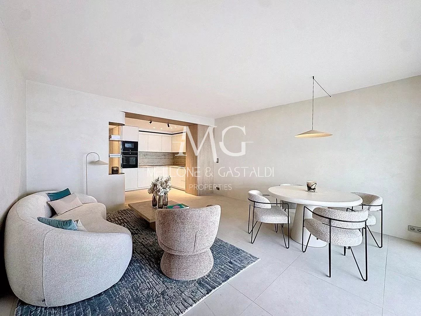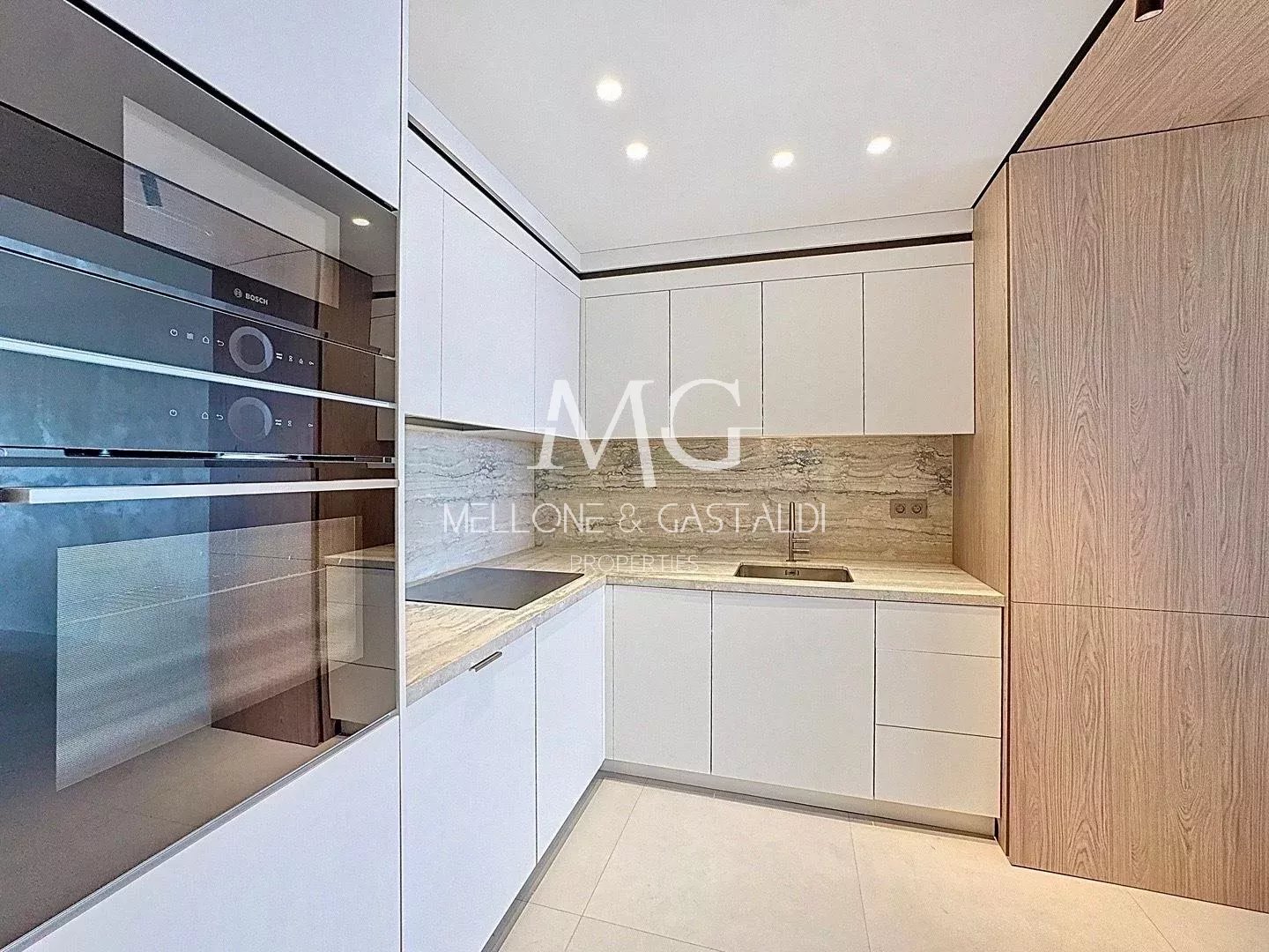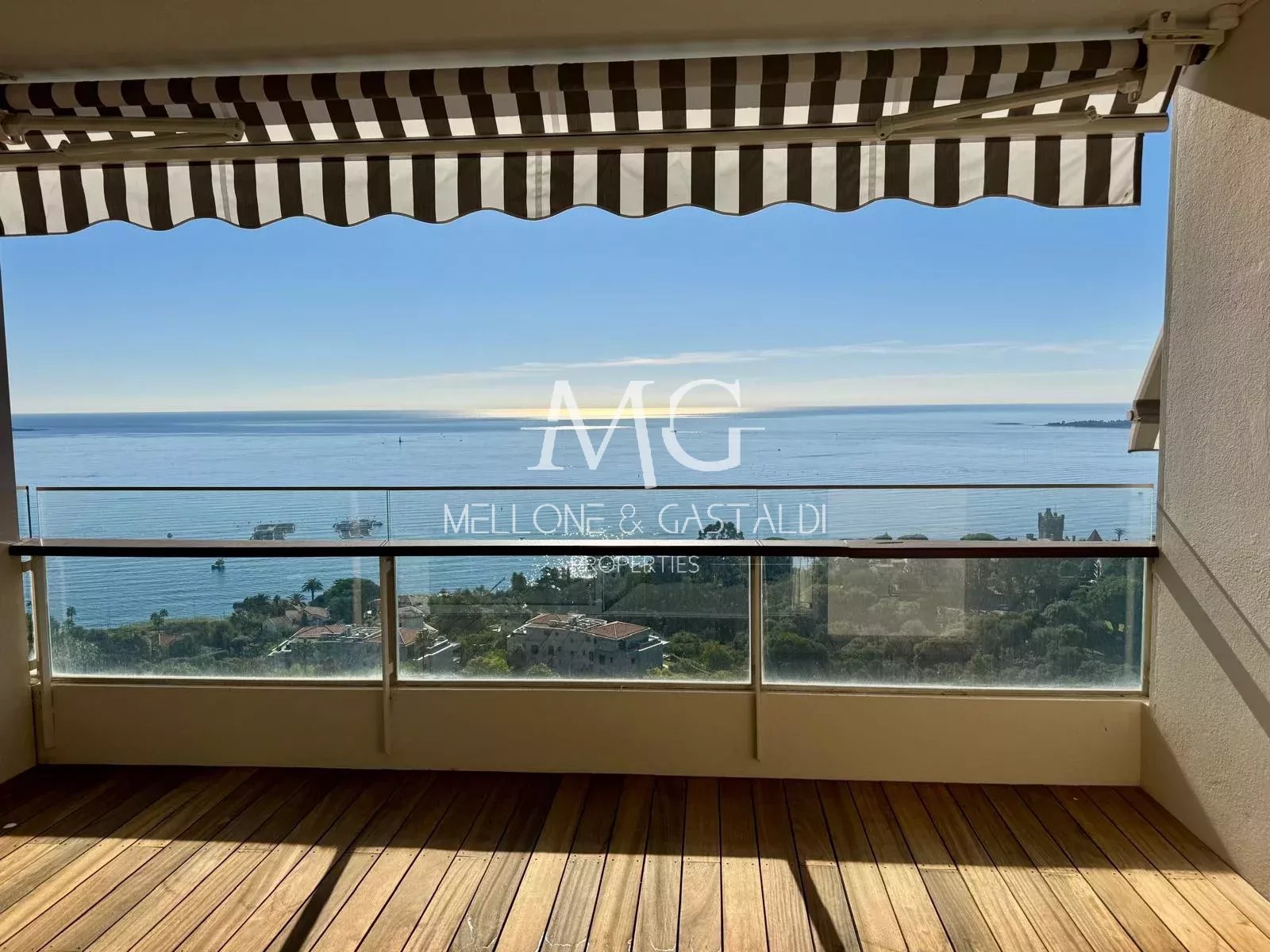Located on a high floor, the apartment enjoys abundant natural light and offers a spacious living room opening onto a beautiful wooden terrace with a panoramic sea view over the Lérins Islands.
